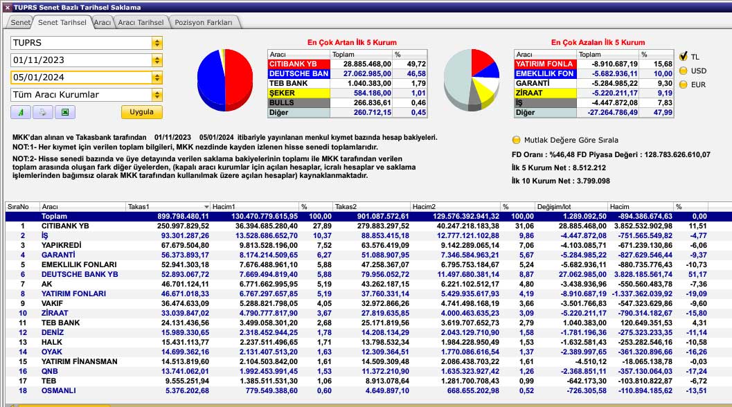 Ancak Tüpraş (TUPRS), borsamızda KY’nin en zayıf olduğu hisselerin başında yer alıyor. 01 Kasım 2023 ile 05 Ocak 2024 tarihleri arasında kısa dönem takaslara baktığımızda maalesef en çok Tüpraş (TUPRS) hissesi bulunan kurum Citibank. Toplam 902 milyon lotun 251 milyon lotu Citibank takasında yani yabancı yatırımcılara ait. Bu rakam toplam takasın %27,89’una denk geliyor. 6. sırada ise Deutschebank’ı görüyoruz. 53 milyon lota yakın da onun takasında, o da %5,88’ine denk geliyor.